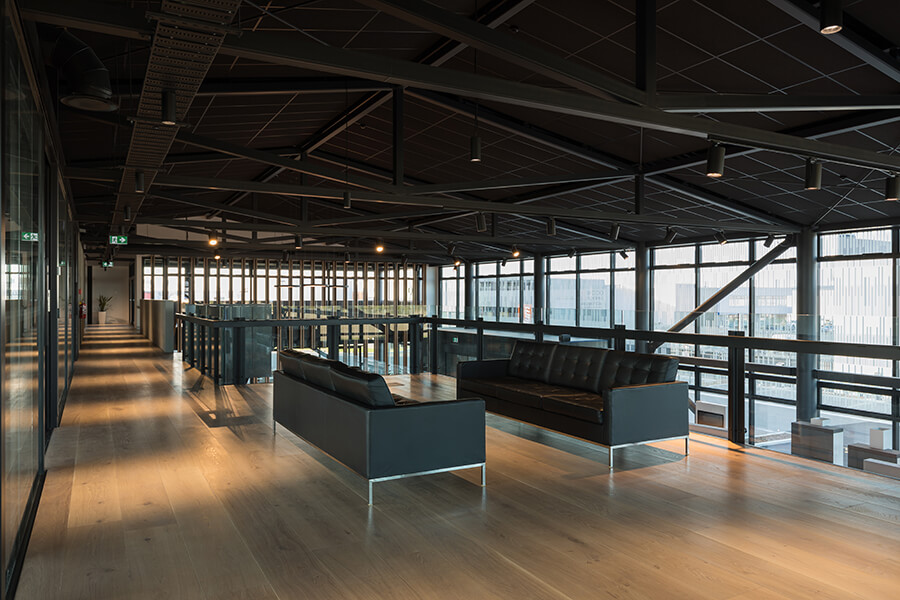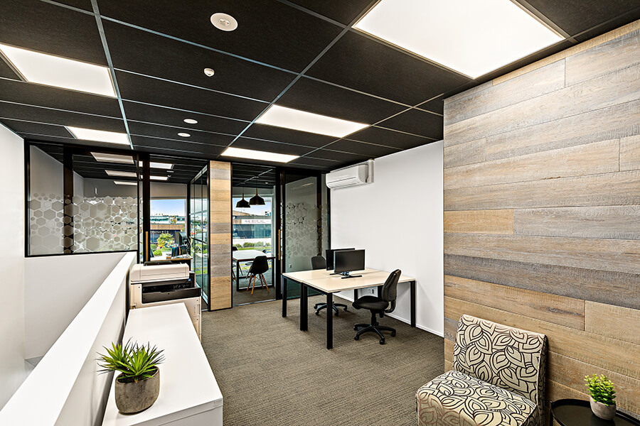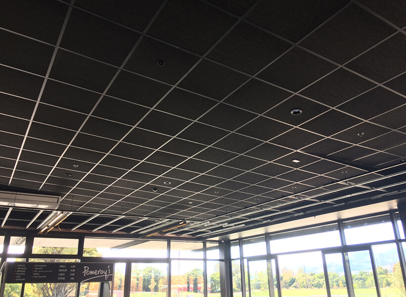 Smooth laminated black ceiling tiles with high acoustic absorption for enhanced acoustic comfort.