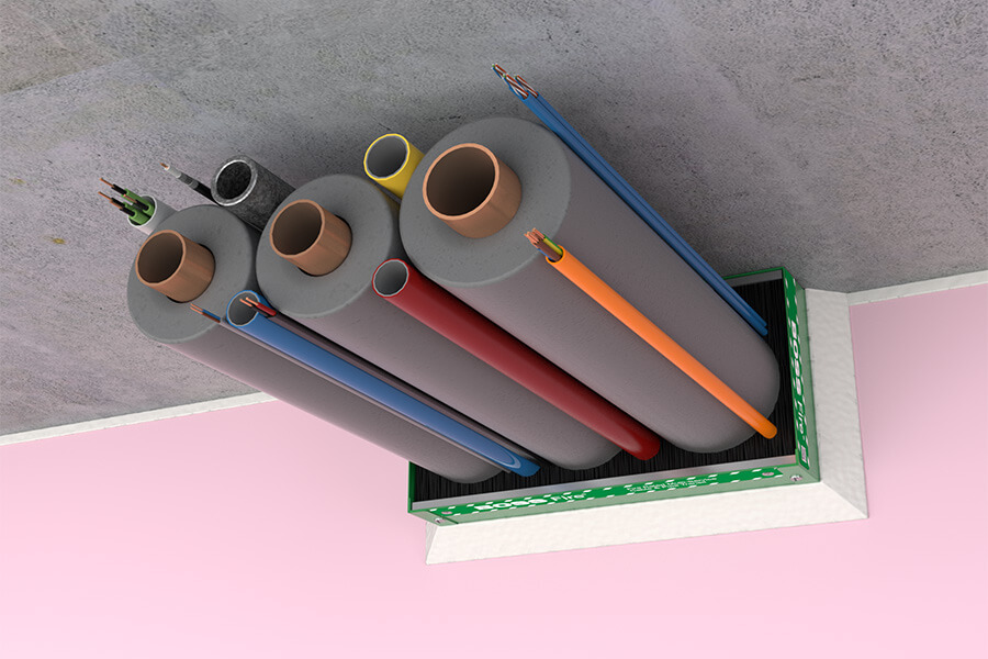 The BOSS FyreBox is revolutionising firestopping methods for large bundles of mixed services. Designed to allow large bundles of pipes and cables to all pass through one single fire rated enclosure, the Fire Transit Box is the only tested and proven method of firestopping multiple services with such simplicity of installation and ease of compliance. Commonly used for apartment entry configurations above an entry door to an SOU, the Fire Box is also suited for service risers, shafts, plant areas and data rooms in a variety of residential, commercial and industrial buildings.
