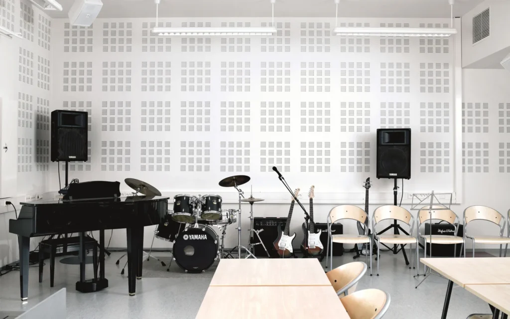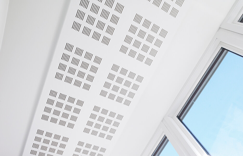 High levels of acoustic absorption are achieved through a combination of perforation patterns and a highly effective white acoustic fabric backing which also prevents dust from the ceiling entering the room and masks the ceiling framework.